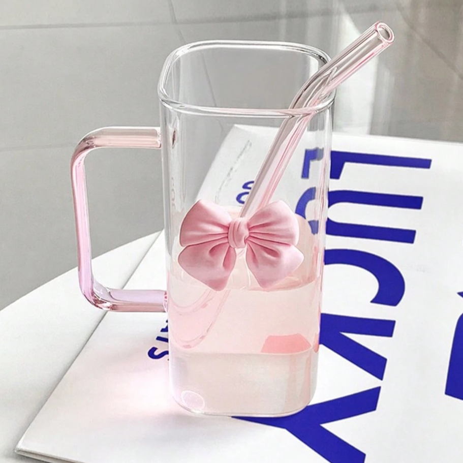 Szklanka wyróżnia się prostokątnym kształtem i uroczą różową kokardką, która dodaje całości dziewczęcego uroku.