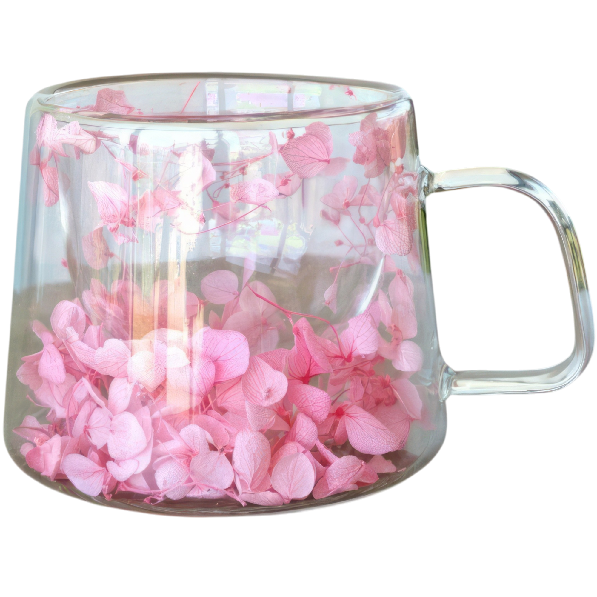We wnętrzu podwójnych ścianek tej niezwykłej szklanki znajdują się kwiaty gipsówki – dzięki temu wygląda, jakby unosił się w niej mały kwiatowy ogród.