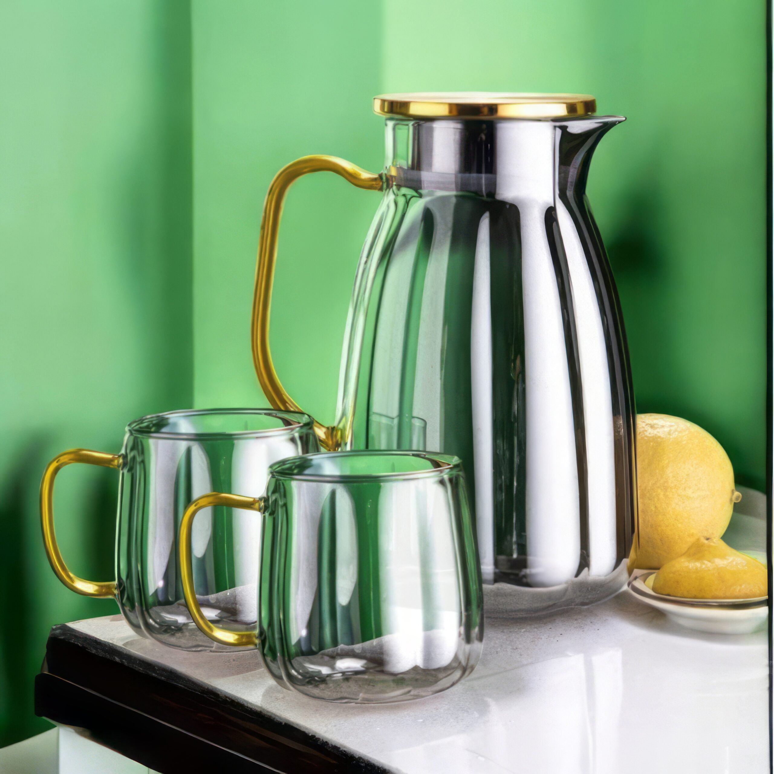 Szukasz czegoś stylowego i praktycznego do serwowania napojów? Ten wyjątkowy zestaw – ryflowany dzbanek ze złotą pokrywką i 2 szklanki – łączy w sobie nowoczesny design, funkcjonalność i trwałość.